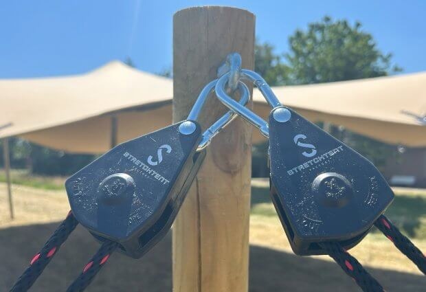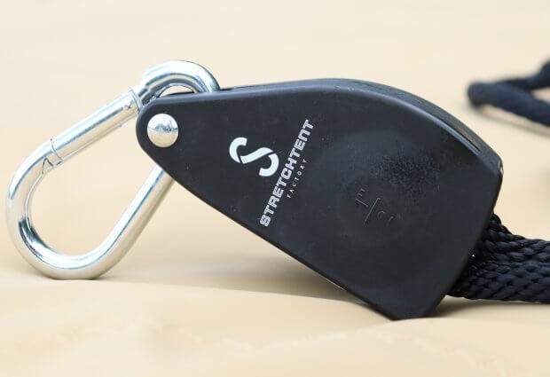 Rope Ratchet spänner repen. Tack vare sin självlåsande mekanism fjädrar inte repet tillbaka. Detta förenklar avsevärt att sätta upp och spänna tältet.